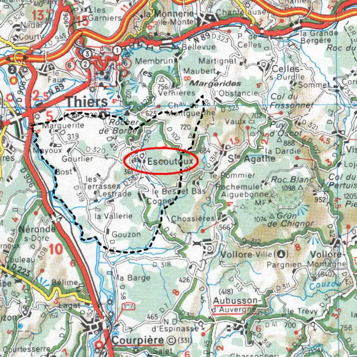Au cœur du Parc Régional Livradois Forez Escoutoux et sa commune (en pointillés) / carte Michelin Ferrier, le siège de l'association Escotal / carte IGN |